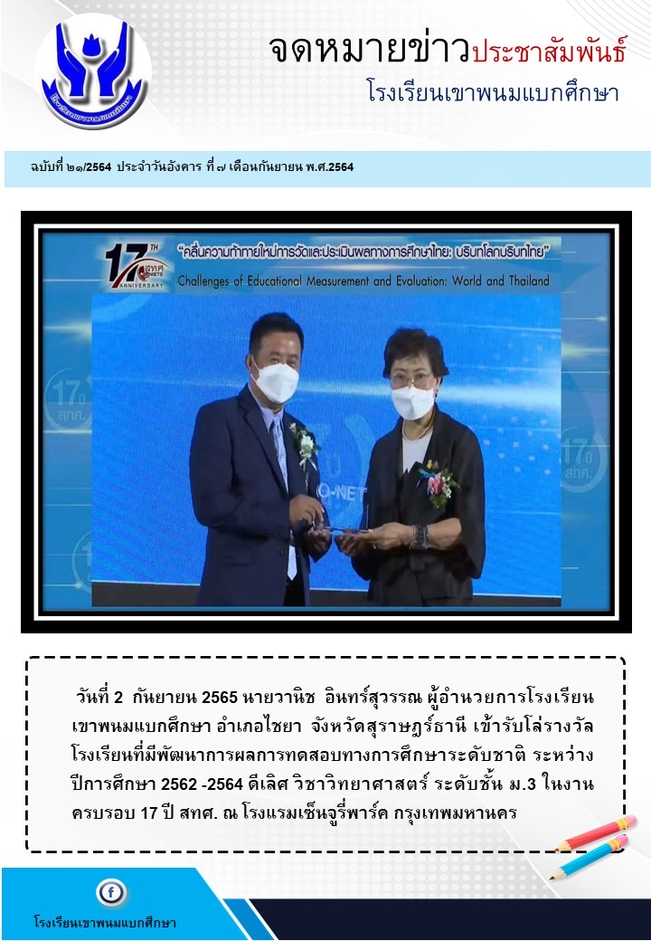 วันที่ 2 กันยายน 2565 นายวานิช อินทร์สุวรรณ ผู้อำนวยการโรงเรียนเขาพนมแบกศึกษา เข้ารับโล่รางวัลโรงเรียนที่มีพัฒนาการผลการทดสอบทางการศึกษาระดับชาติ