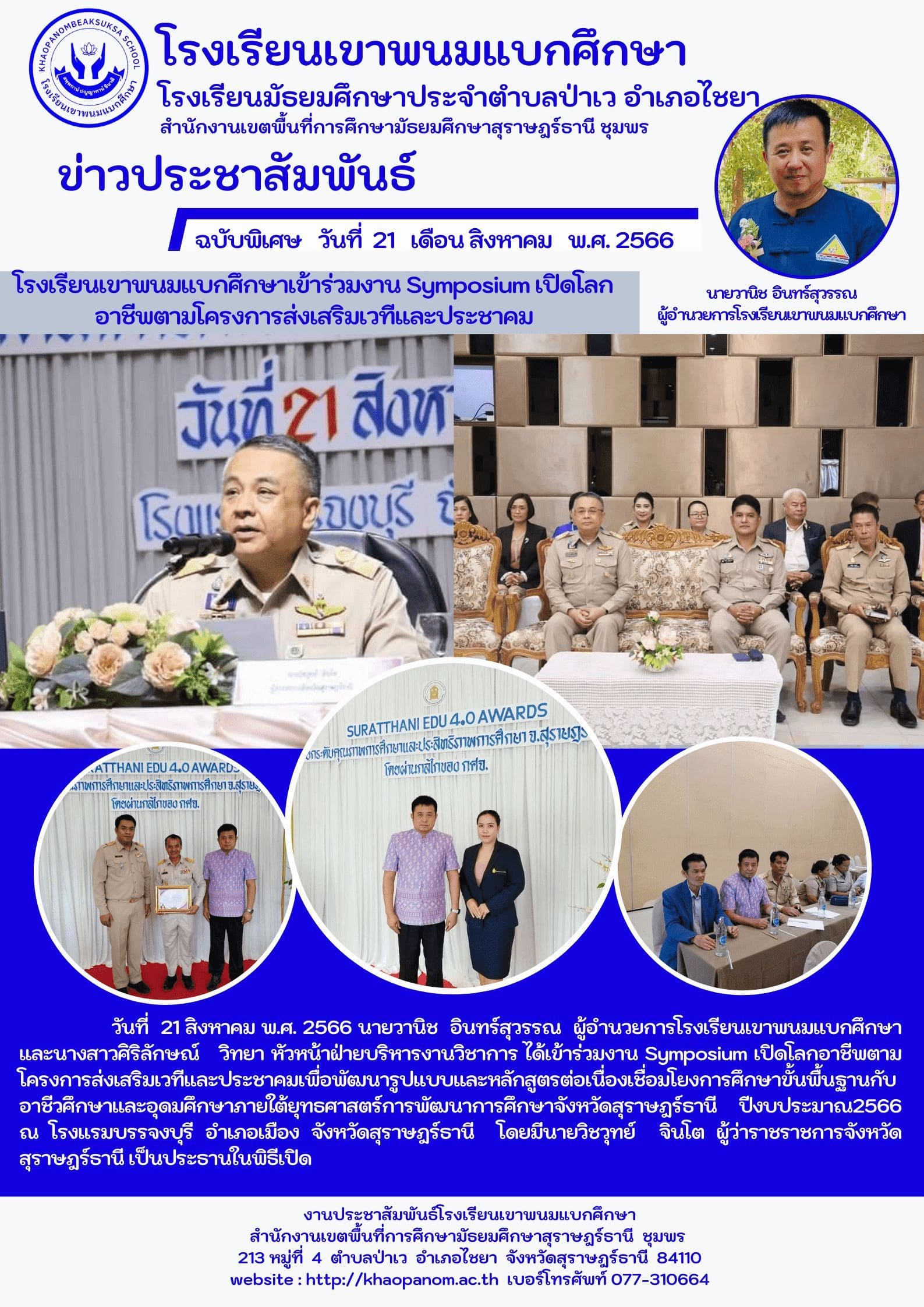 วันที่ 21 สิงหาคม พ.ศ. 2566 นายวานิช อินทร์สุวรรณ ผู้อำนวยการโรงเรียนเขาพนมแบกศึกษา และนางสาวศิริลักษณ์ วิทยา หัวหน้าฝ่ายบริหารงานวิชาการ ได้เข้าร่วมงาน Symposium เปิดโลกอาชีพ
