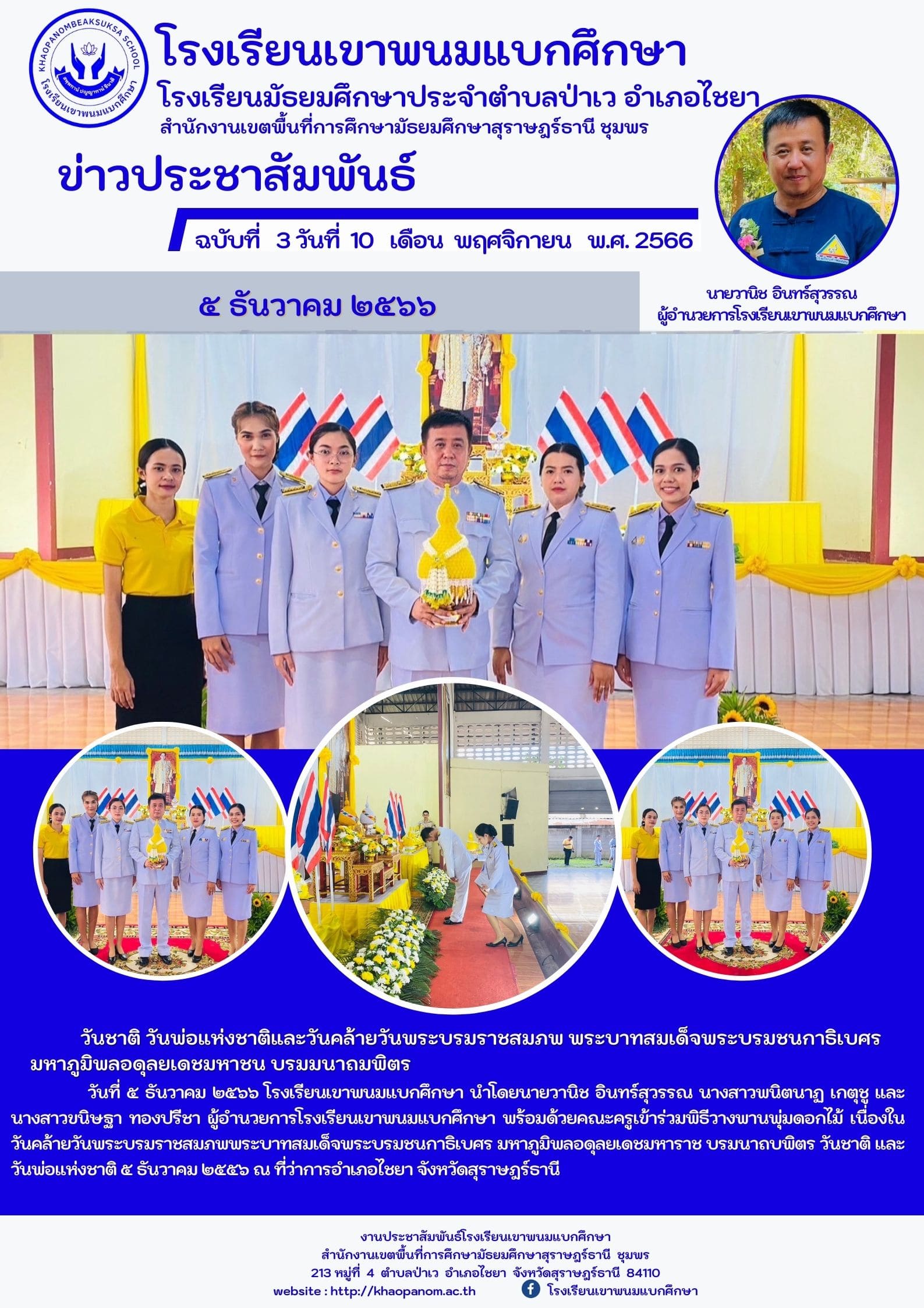 วันที่ 5 ธันวาคม 2566 โรงเรียนเขาพนมแบกศึกษา ร่วมพิธีวางพานพุ่มถวายราชสักการะ เนื่องในวันคล้ายวันพระบรมราชสมภพ พระบาทสมเด็จพระบรมชนกาธิเบศร มหาภูมิพลอดุลยเดชมหาราช บรมนาถบพิตร วันชาติ และวันพ่อแห่งชาติ 5 ธันวาคม 2566 ณ ที่ว่าการอำเภอไชยา จังหวัดสุราษฎร์ธ