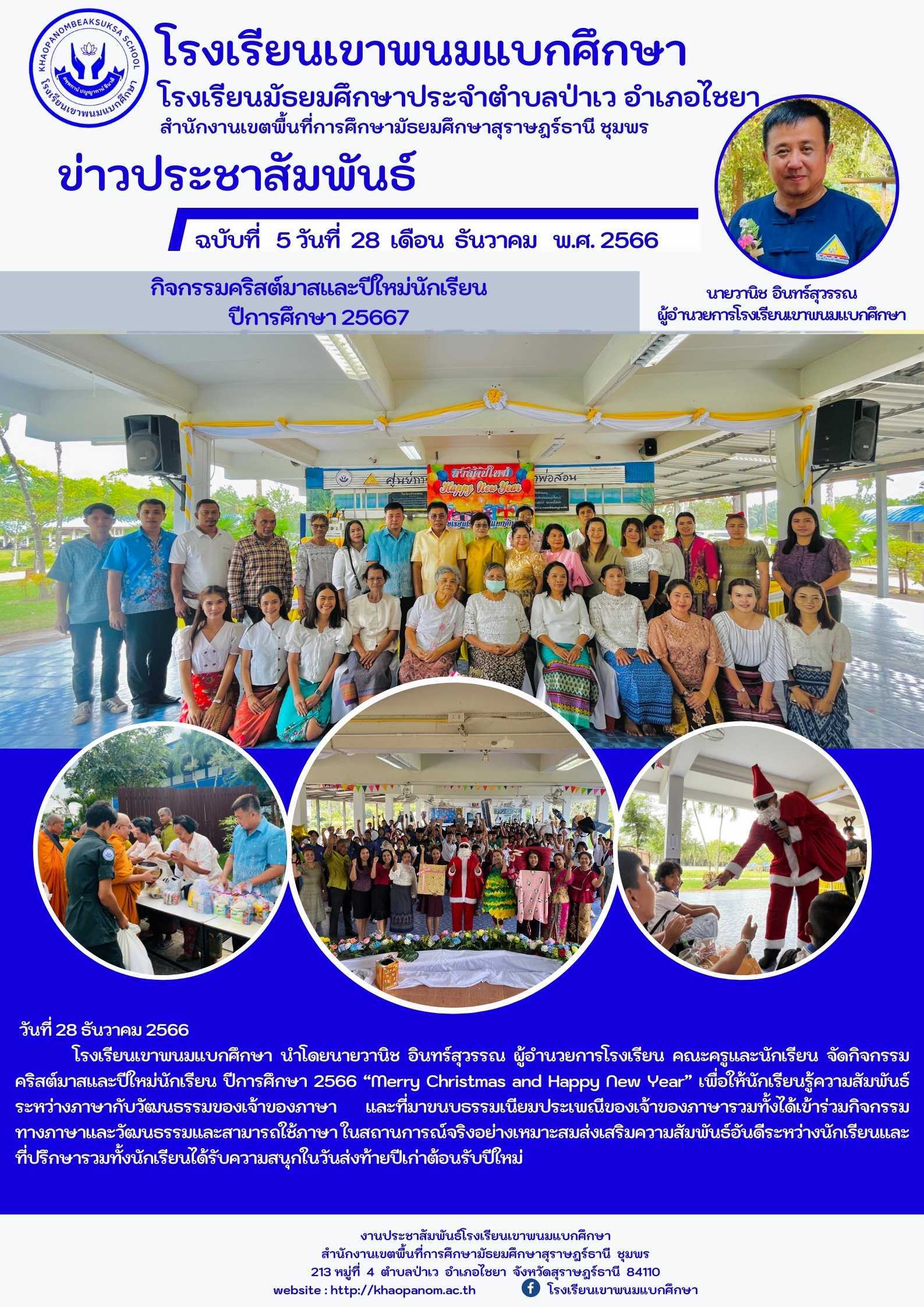 วันที่ 28 ธันวาคม 2566 โรงเรียนเขาพนมแบกศึกษา นำโดยนายวานิช อินทร์สุวรรณ ผู้อำนวยการโรงเรียน คณะครูและนักเรียน จัดกิจกรรมคริสต์มาสและปีใหม่นักเรียน ปีการศึกษา 2566 “Merry Christmas and Happy New Year” เพื่อให้นักเรียนรู้ความสัมพันธ์ระหว่างภาษากับว