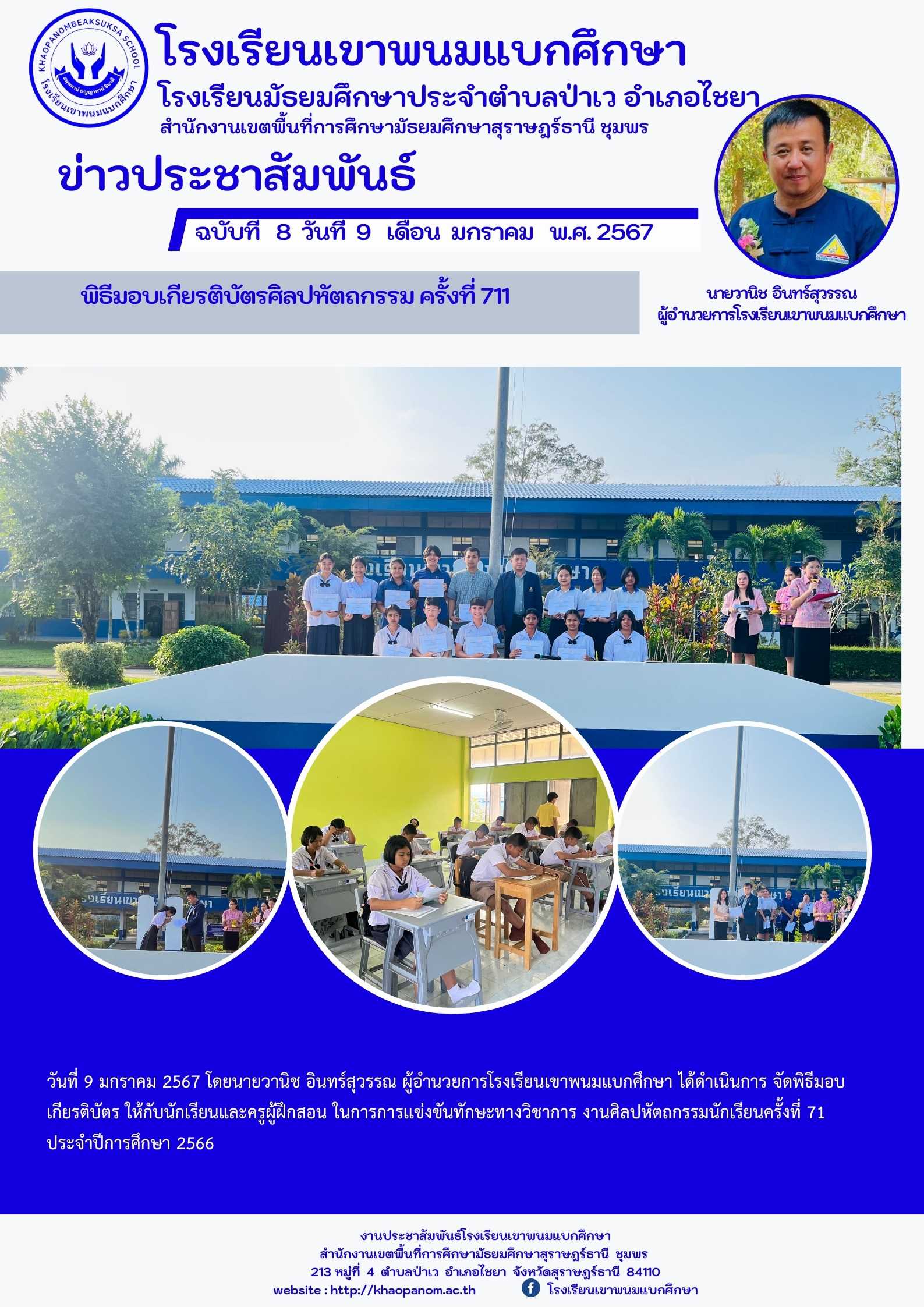 วันที่ 9 มกราคม 2567 โดยนายวานิช อินทร์สุวรรณ ผู้อำนวยการโรงเรียนเขาพนมแบกศึกษา ได้ดำเนินการ จัดพิธีมอบเกียรติบัตร ให้กับนักเรียนและครูผู้ฝึกสอน ในการการเเข่งขันทักษะทางวิชาการ งานศิลปหัตถกรรมนักเรียนครั้งที่ 71 ประจำปีการศึกษา 2566