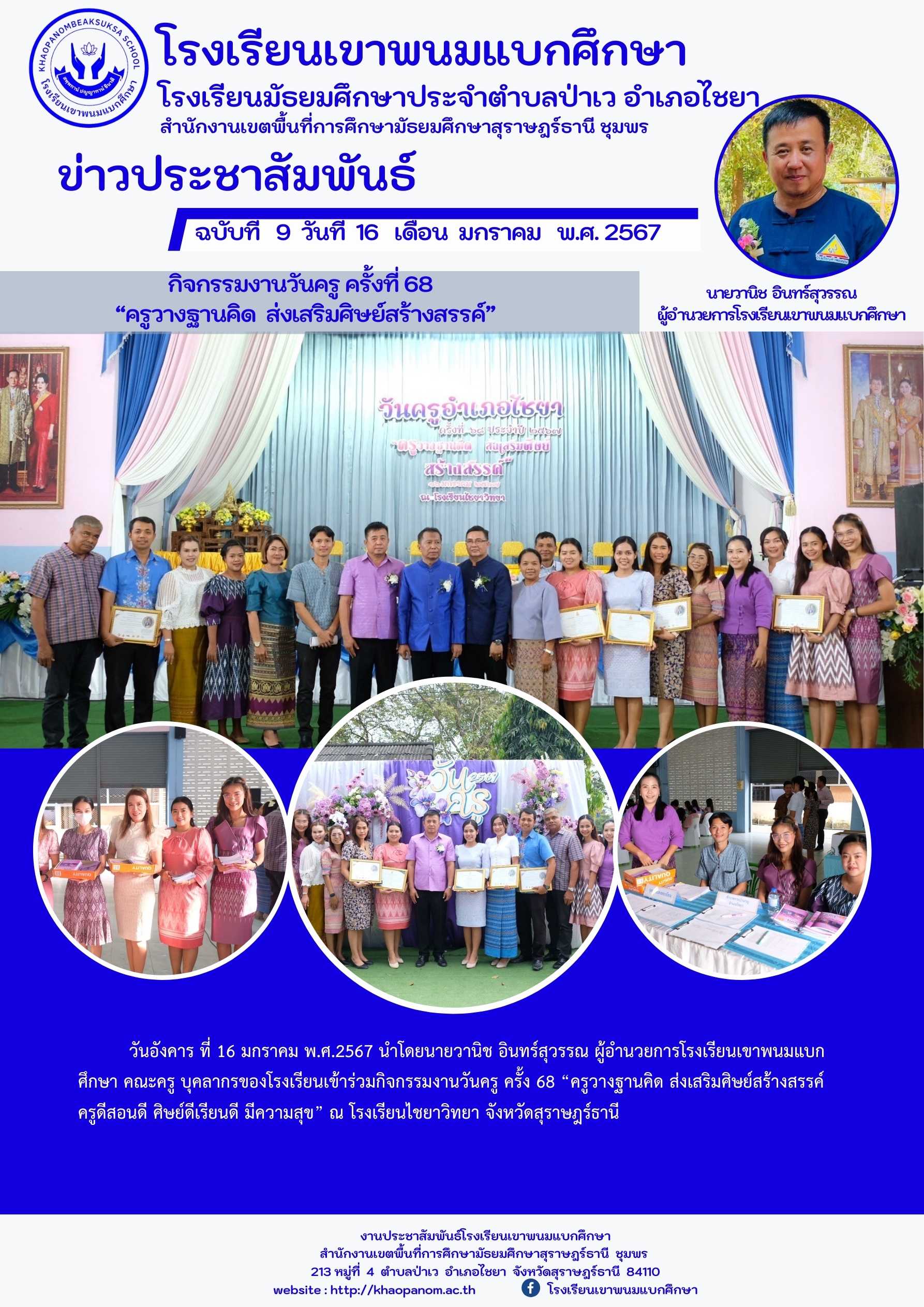 วันอังคาร ที่ 16 มกราคม พ.ศ.2567 นำโดยนายวานิช อินทร์สุวรรณ ผู้อำนวยการโรงเรียนเขาพนมแบกศึกษา คณะครู บุคลากรของโรงเรียนเข้าร่วมกิจกรรมงานวันครู ครั้ง 68 “ครูวางฐานคิด ส่งเสริมศิษย์สร้างสรรค์ ครูดีสอนดี ศิษย์ดีเรียนดี มีความสุข” ณ โรงเรียนไชยาวิทยา จังหวัด