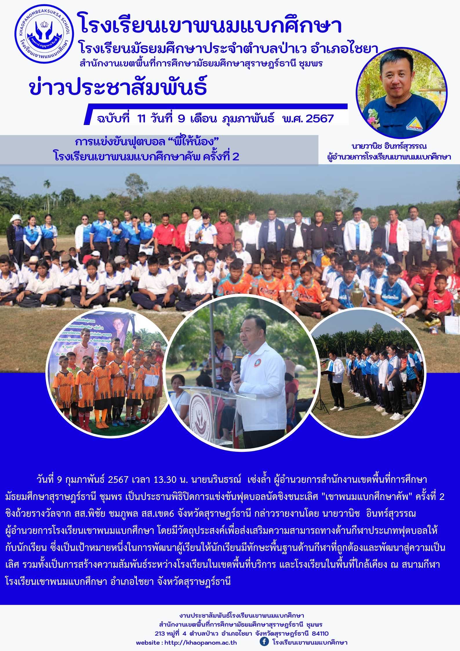 วันที่ 9 กุมภาพันธ์ 2567 เวลา 13.30 น. นายนรินธรณ์ เซ่งล้ำ ผู้อำนวยการสำนักงานเขตพื้นที่การศึกษามัธยมศึกษาสุราษฎร์ธานี ชุมพร เป็นประธานพิธิปิดการแข่งขันฟุตบอลนัดชิงชนะเลิศ