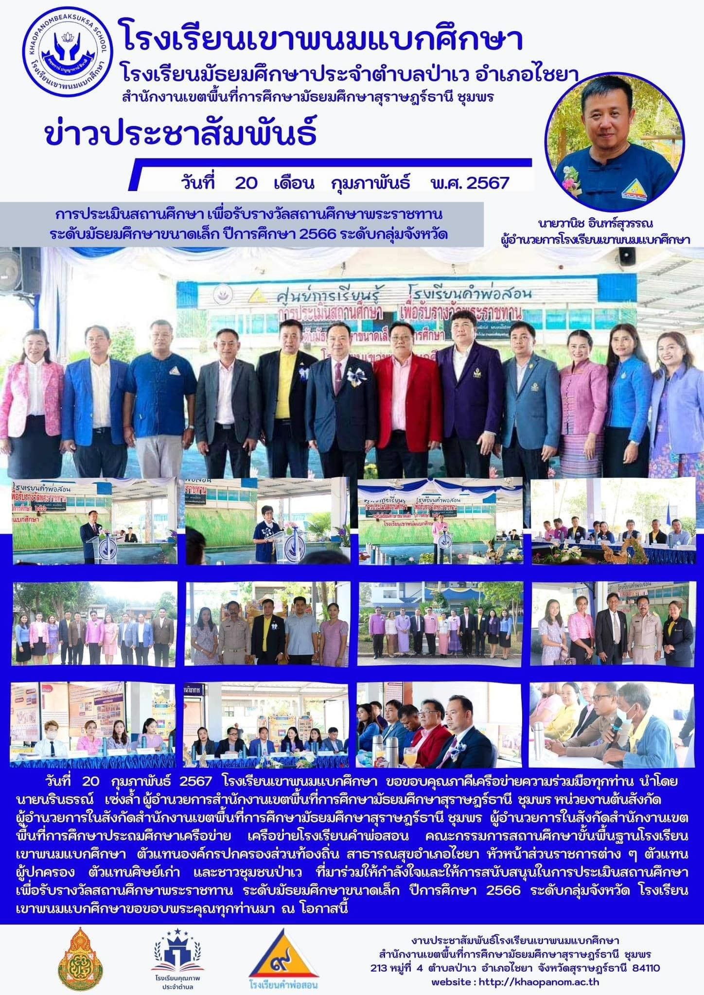 วันที่ 20 กุมภาพันธ์ 2567 โรงเรียนเขาพนมแบกศึกษา ขอขอบคุณภาคีเครือข่ายความร่วมมือทุกท่าน นำโดยนายนรินธรณ์ เซ่งล้ำ ผู้อำนวยการสำนักงานเขตพื้นที่การศึกษามัธยมศึกษาสุราษฎร์ธานี ชุมพร หน่วยงานต้นสังกัด ผู้อำนวยการในสังกัดสำนักงานเขตพื้นที่