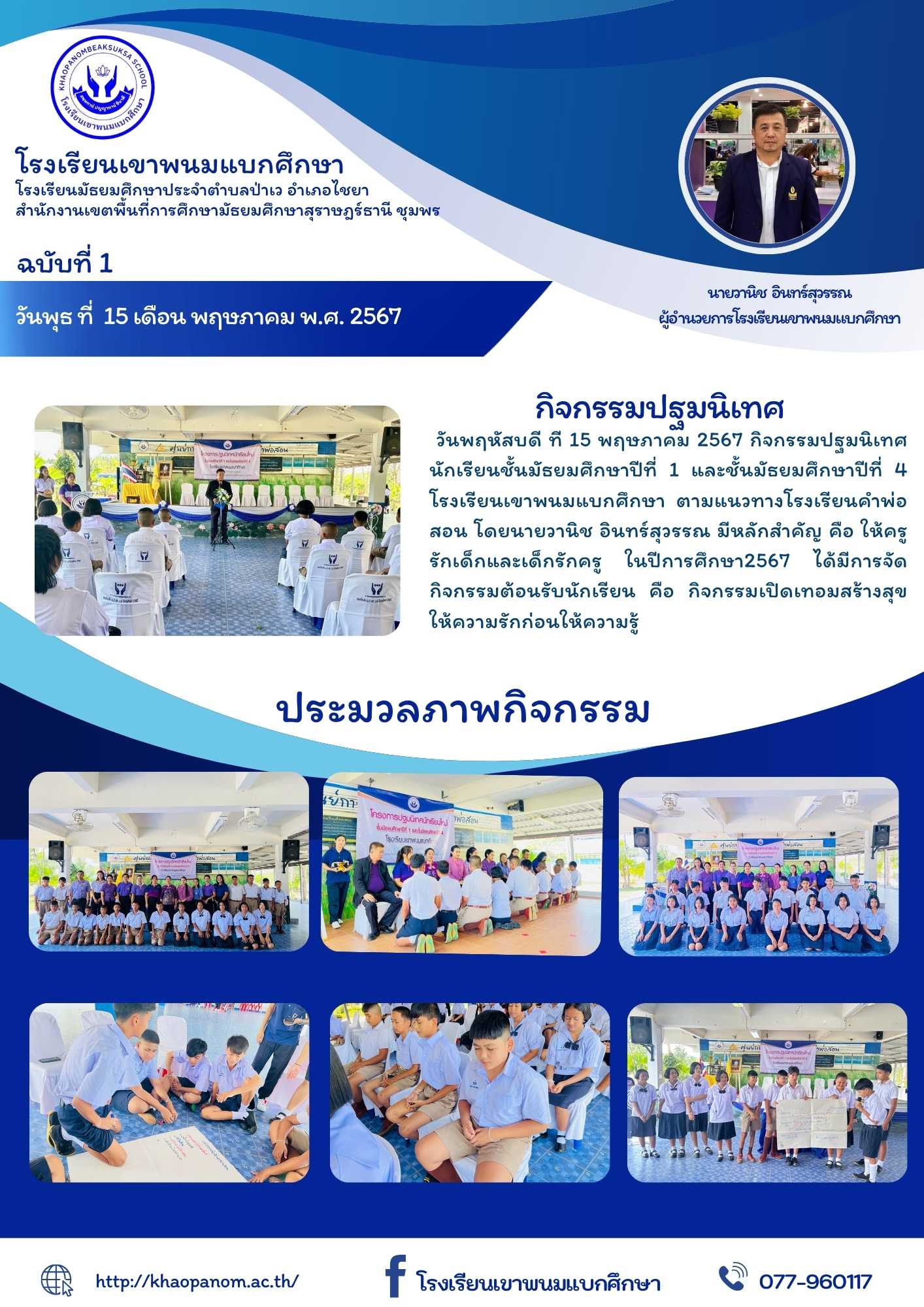 วันพฤหัสบดี ที 15 พฤษภาคม 2567 กิจกรรมปฐมนิเทศนักเรียนชั้นมัธยมศึกษาปีที่ 1 และชั้นมัธยมศึกษาปีที่ 4 โรงเรียนเขาพนมแบกศึกษา ตามแนวทางโรงเรียนคำพ่อสอน โดยนายวานิช อินทร์สุวรรณ มีหลักสำคัญ คือ ให้ครูรักเด็กและเด็กรักครู ในปีการศึกษา2567 ได้มีการจัดกิจกร