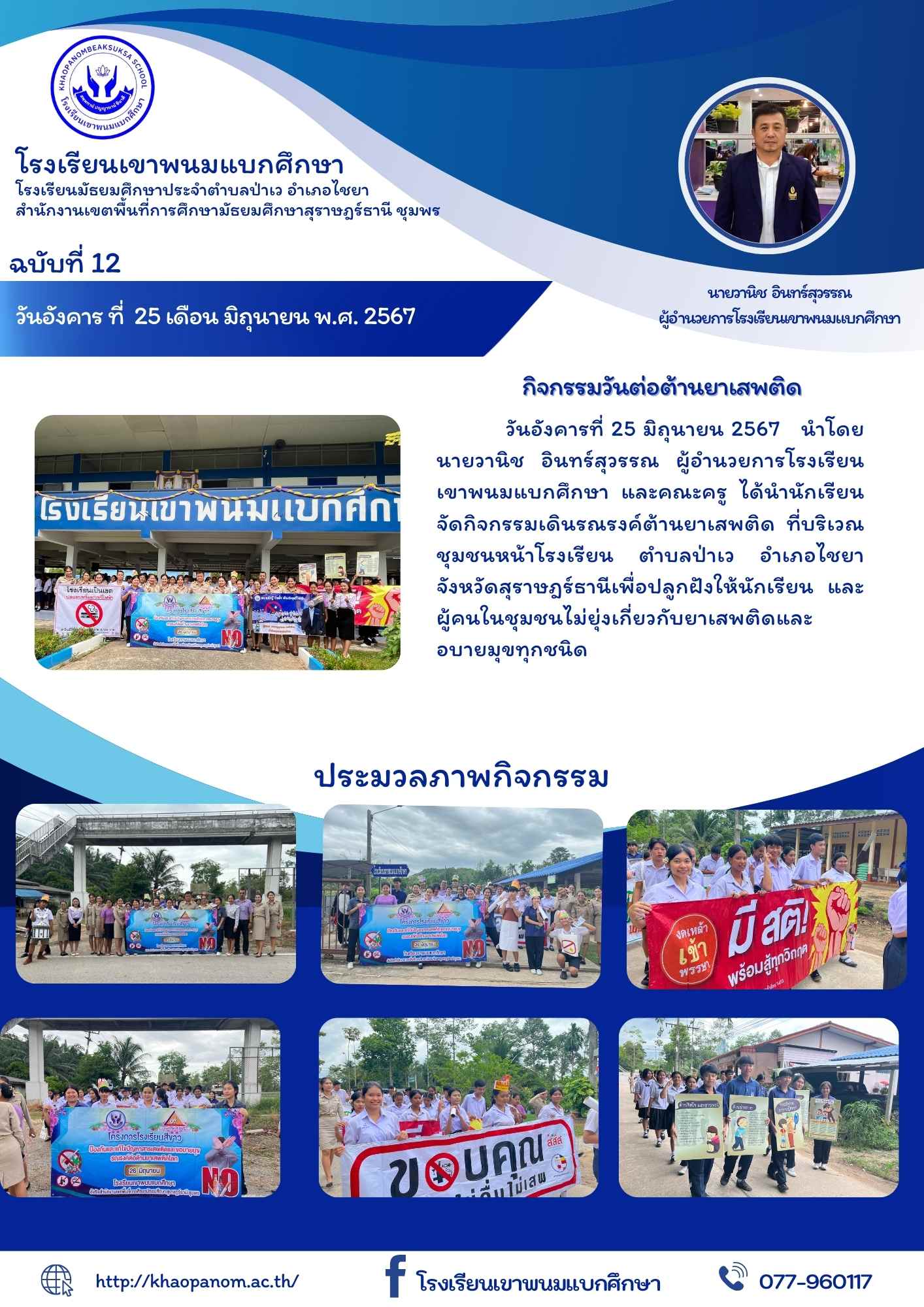 วันอังคารที่ 25 มิถุนายน 2567 นำโดยนายวานิช อินทร์สุวรรณ ผู้อำนวยการโรงเรียนเขาพนมแบกศึกษา และคณะครู ได้นำนักเรียนจัดกิจกรรมเดินรณรงค์ต้านยาเสพติด ที่บริเวณชุมชนหน้าโรงเรียน ตำบลป่าเว อำเภอไชยา จังหวัดสุราษฎร์ธานีเพื่อปลูกฝังให้นักเรียน และผู้คนในชุมชนไ