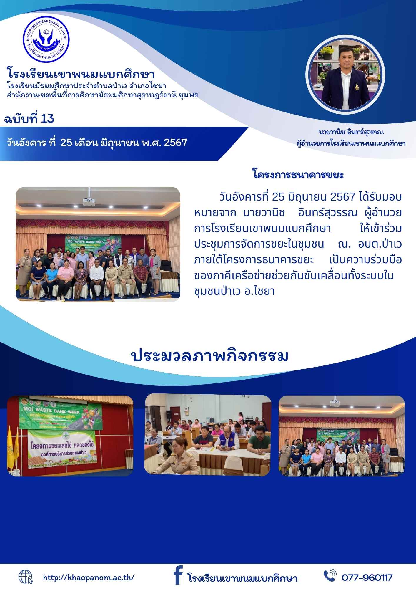 วันอังคารที่ 25 มิถุนายน 2567 ได้รับมอบหมายจาก นายวานิช อินทร์สุวรรณ ผู้อำนวยการโรงเรียนเขาพนมแบกศึกษา ให้เข้าร่วมประชุมการจัดการขยะในชุมชน ณ. อบต.ป่าเว ภายใต้โครงการธนาคารขยะ เป็นความร่วมมือของภาคีเครือข่ายช่วยกันขับเคลื่อนทั้งระบบในชุมชนป่าเว อ.ไชยา