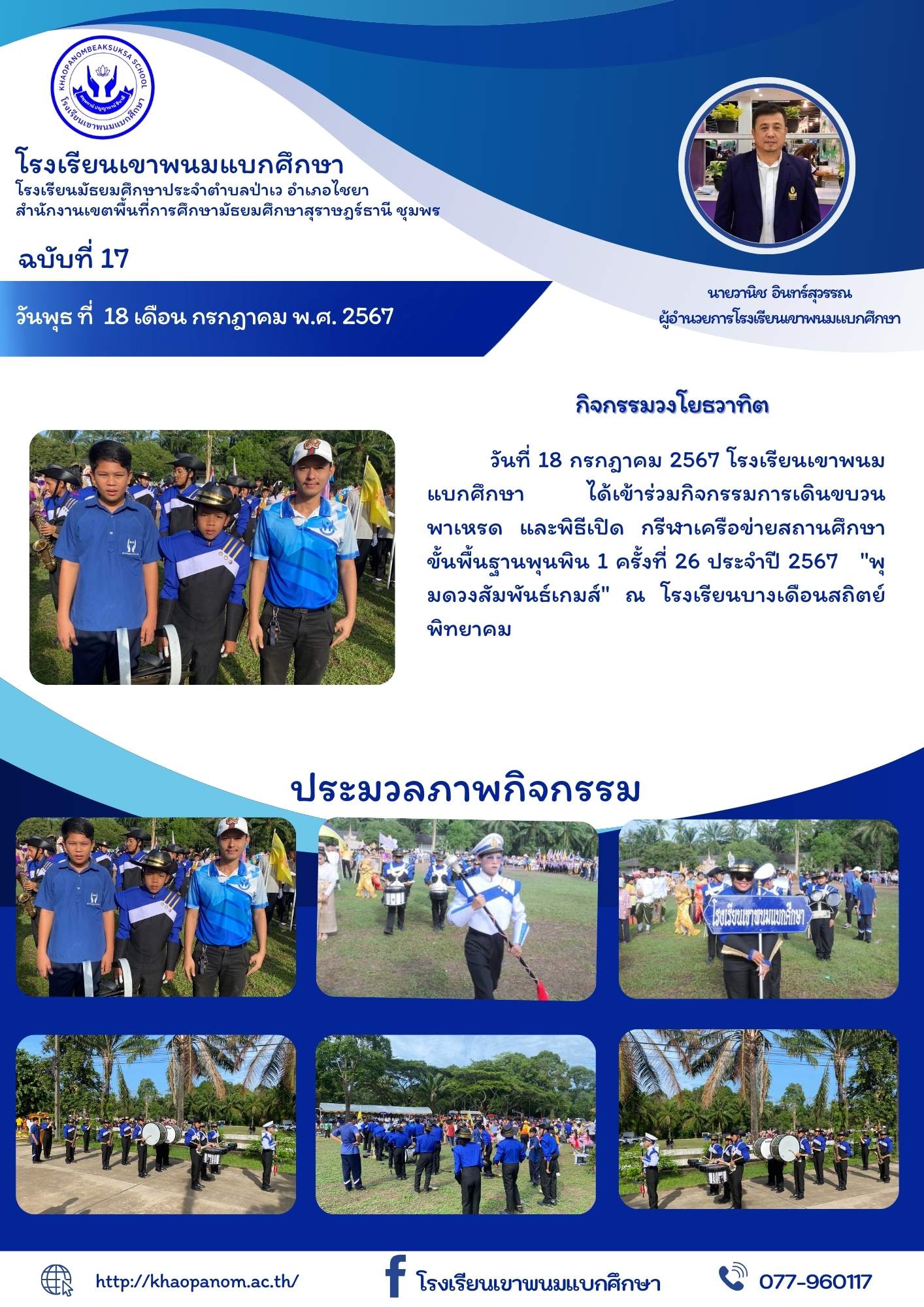 วันที่ 18 กรกฎาคม 2567 โรงเรียนเขาพนมแบกศึกษา ได้เข้าร่วมกิจกรรมการเดินขบวนพาเหรด และพิธีเปิด กรีฬาเครือข่ายสถานศึกษาขั้นพื้นฐานพุนพิน 1 ครั้งที่ 26 ประจำปี 2567 "พุมดวงสัมพันธ์เกมส์" ณ โรงเรียนบางเดือนสถิตย์พิทยา