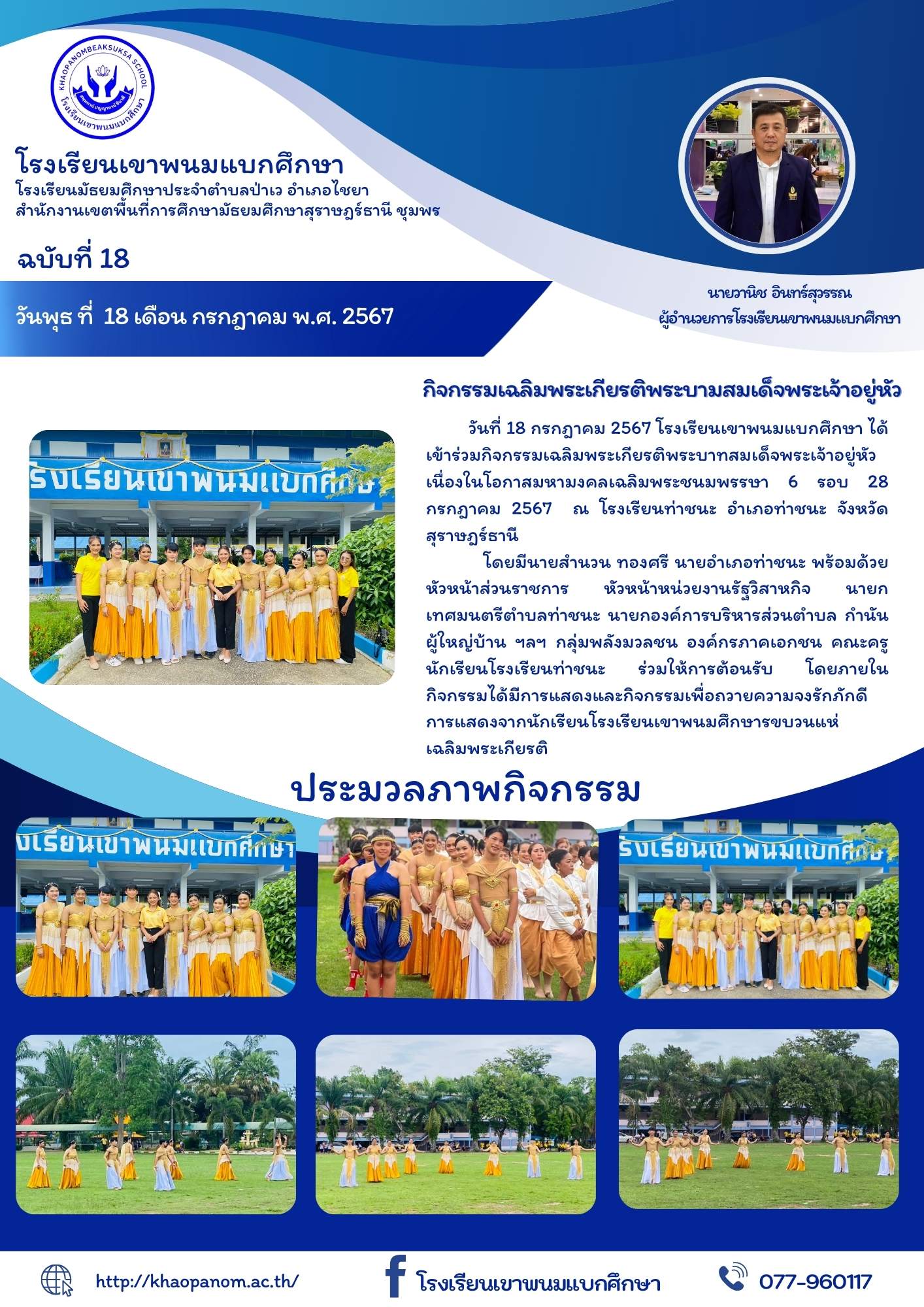 วันที่ 18 กรกฎาคม 2567 โรงเรียนเขาพนมแบกศึกษา ได้เข้าร่วมกิจกรรมเฉลิมพระเกียรติพระบาทสมเด็จพระเจ้าอยู่หัวเนื่องในโอกาสมหามงคลเฉลิมพระชนมพรรษา 6 รอบ 28 กรกฎาคม 2567 ณ โรงเรียนท่าชนะ อำเภอท่าชนะ จังหวัดสุราษฎร์ธานี โดยมีนายสำนวน ทองศรี นายอำเภอท