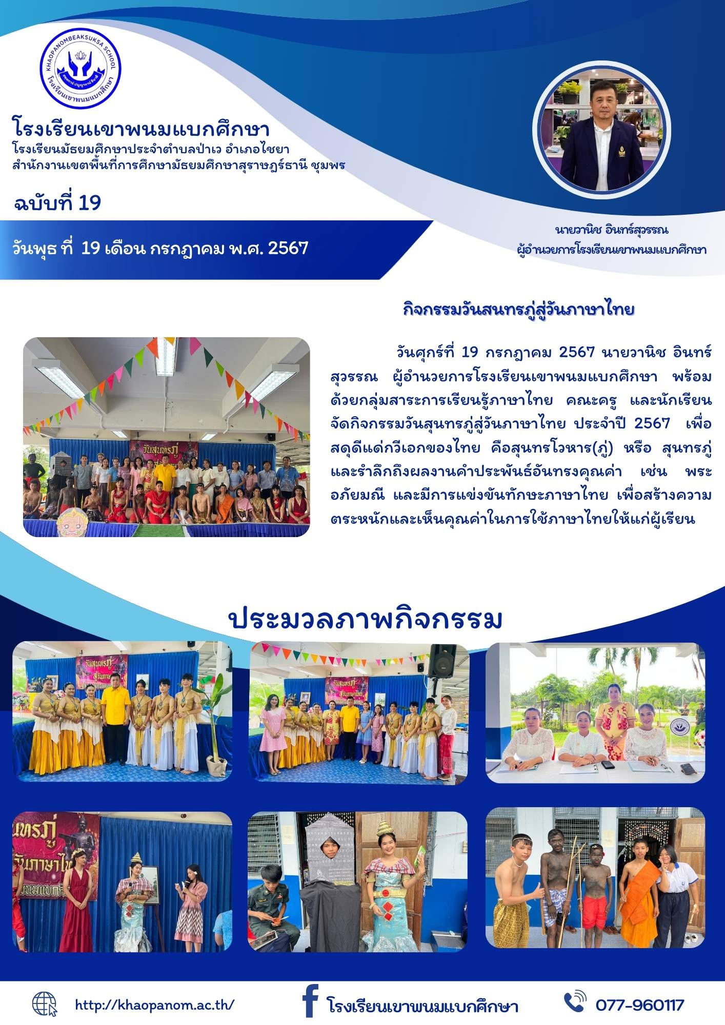 วันศุกร์ที่ 19 กรกฎาคม 2567 นายวานิช อินทร์สุวรรณ ผู้อำนวยการโรงเรียนเขาพนมแบกศึกษา พร้อมด้วยกลุ่มสาระการเรียนรู้ภาษาไทย คณะครู และนักเรียน จัดกิจกรรมวันสุนทรภู่สู่วันภาษาไทย ประจำปี 2567 เพื่อสดุดีแด่กวีเอกของไทย คือสุนทรโวหาร(ภู่) หรือ สุนทรภู่ และรำลึ