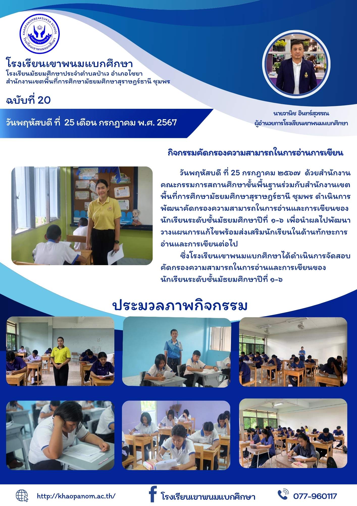 วันพฤหัสบดี ที่ 25 กรกฎาคม ๒๕๖๗ ด้วยสำนักงานคณะกรรมการสถานศึกษาขั้นพื้นฐานร่วมกับสำนักงานเขตพื้นที่การศึกษามัธยมศึกษาสุราษฎร์ธานี ชุมพร ดำเนินการพัฒนาคัดกรองความสามารถในการอ่านและการเขียนของนักเรียนระดับชั้นมัธยมศึกษาปีที่ ๑-๖ เพื่อนำผลไปพัฒนาวางแผนการแก