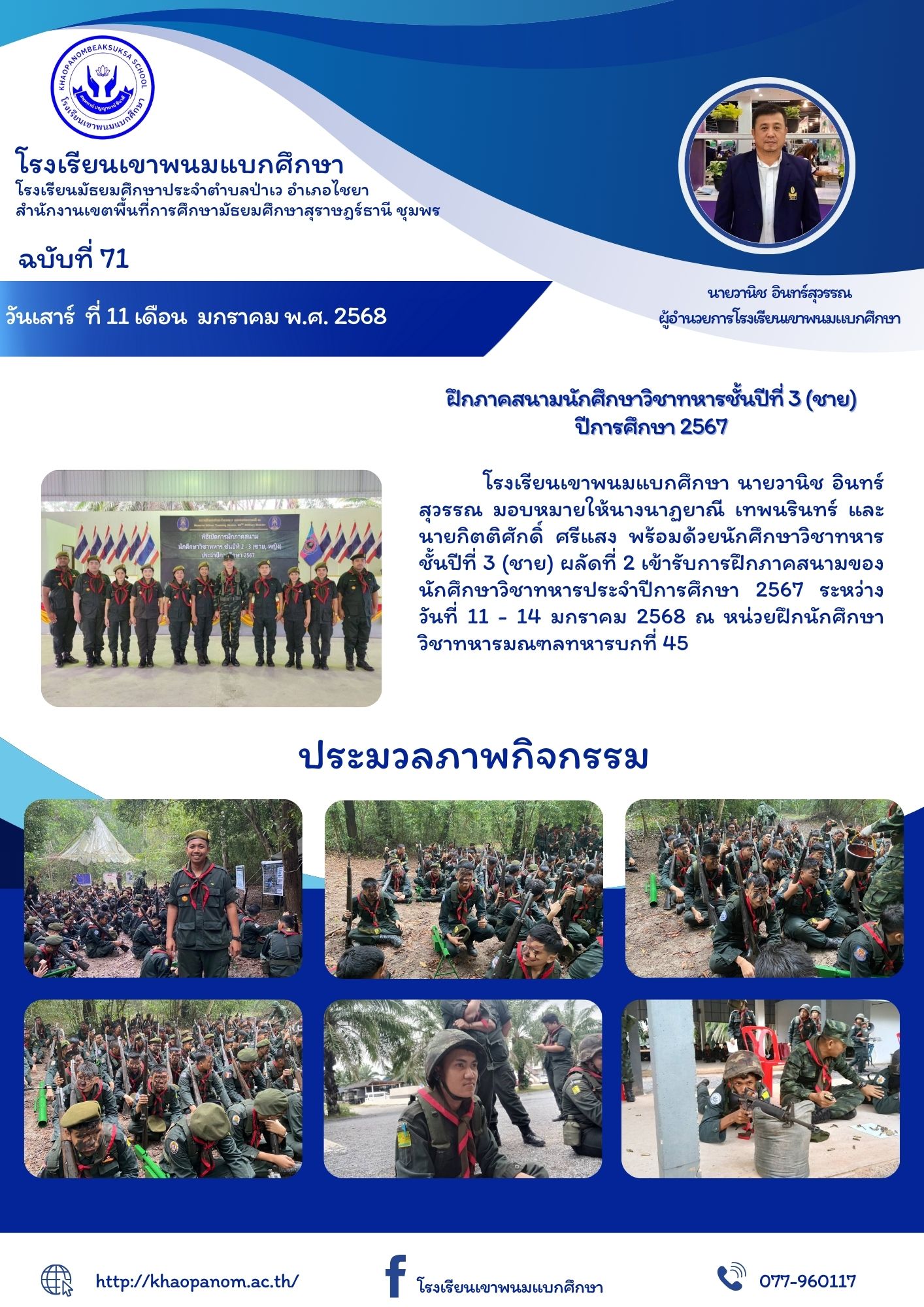 โรงเรียนเขาพนมแบกศึกษา นายวานิช อินทร์สุวรรณ มอบหมายให้ นางนาฏยาณี เทพนรินทร์ และนายกิตติศักดิ์ ศรีแสง พร้อมด้วยนักศึกษาวิชาทหารชั้นปีที่ 3 (ชาย) ผลัดที่ 2 เข้ารับการฝึกภาคสนามของนักศึกษาวิชาทหาร ประจำปีการศึกษา 2567 ระหว่างวันที่ 11 - 14 มกราคม 2568 ณ