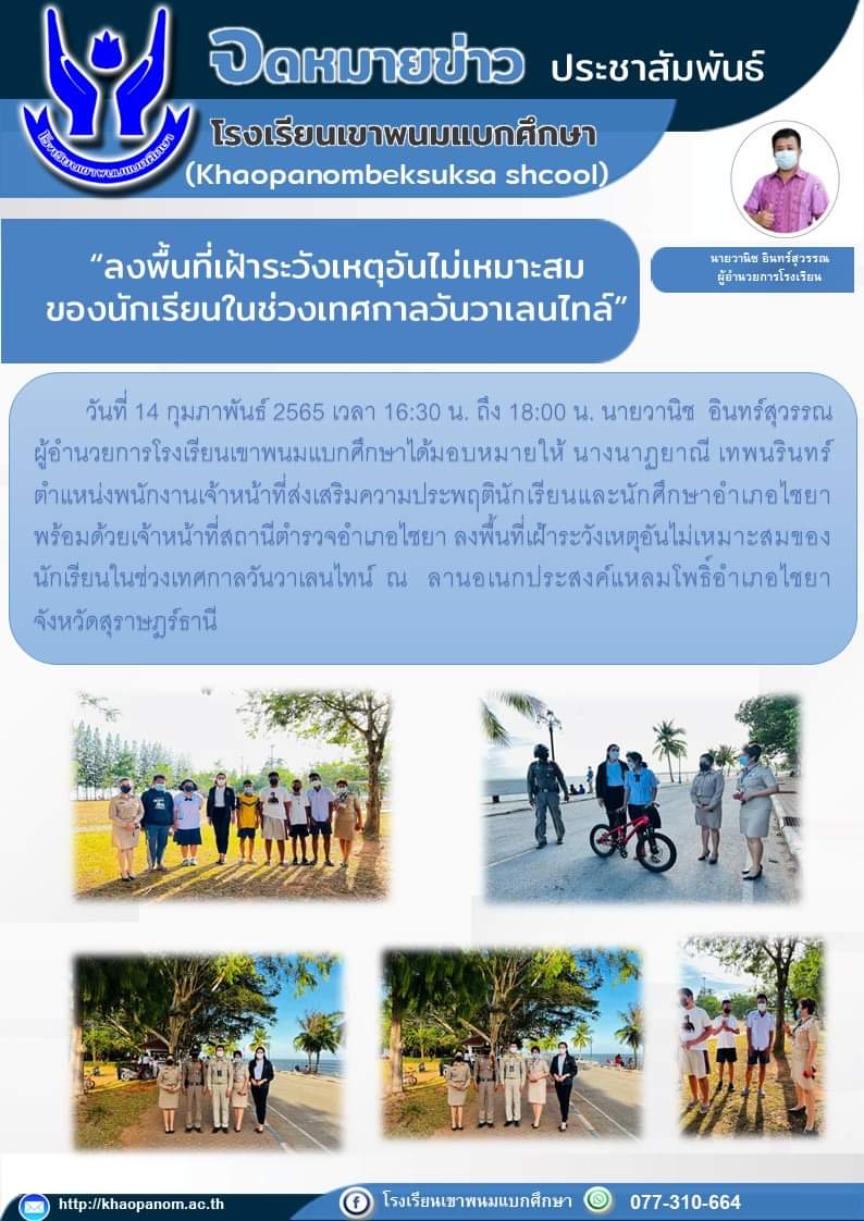 เมื่อวันที่14 กุมภาพันธ์ 2565 เวลา 16:30 น. นายวานิชอินสุวรรณผู้อำนวยการโรงเรียนเขาพนมแบกศึกษาได้มอบหมายให้นางนาฏยานี เทพนรินทร์ลงพื้นที่เฝ้าระวังเหตุอันไม่เหมาะสมของนักเรียนในเทศกาลวาเลนไทน์ ณ ลานอเนกประสงค์แหลมโพธิ์อำเภอไชยาจังหวัดสุราษฎร์ธานี