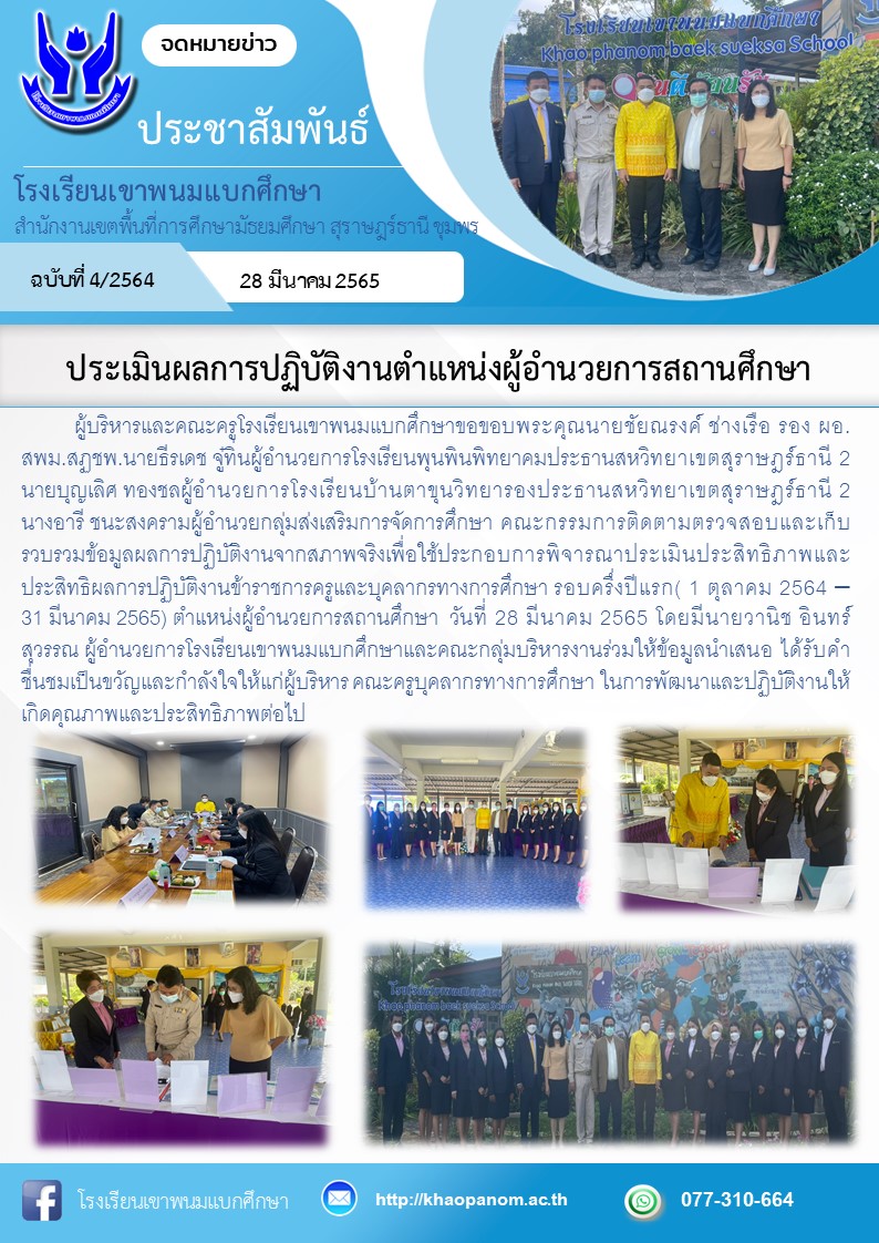 วันที่ 28 มีนาคม 2565 นายวินิช อินทร์สุวรรณ ผู้อำนวยการโรงเรียนเขาพนมแบกศึกษาได้รับการประเมินผลการปฏิบัติงานตำแหน่งผู้อำนวยการสถานศึกษา จากสำนักงานเขตพื้นที่การศึกษาสุราษฏร์ธานี ชุมพร